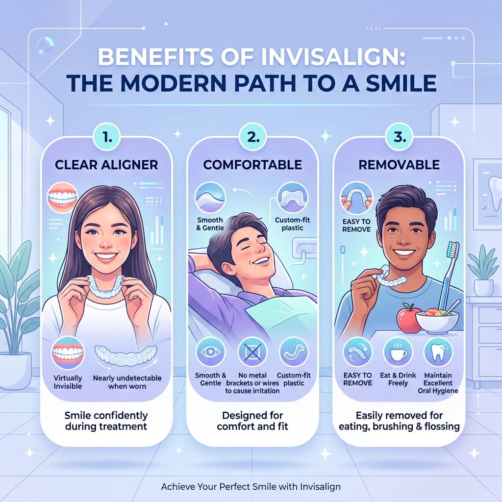 Invisalign is the world's leading clear aligner system by Align Technology. Instead of metal brackets and wires, Invisalign uses a series of custom-made, ultra-clear, removable trays that gently shift your teeth into the perfect position — completely invisibly. Over 10 million patients worldwide have transformed their smiles with Invisalign.